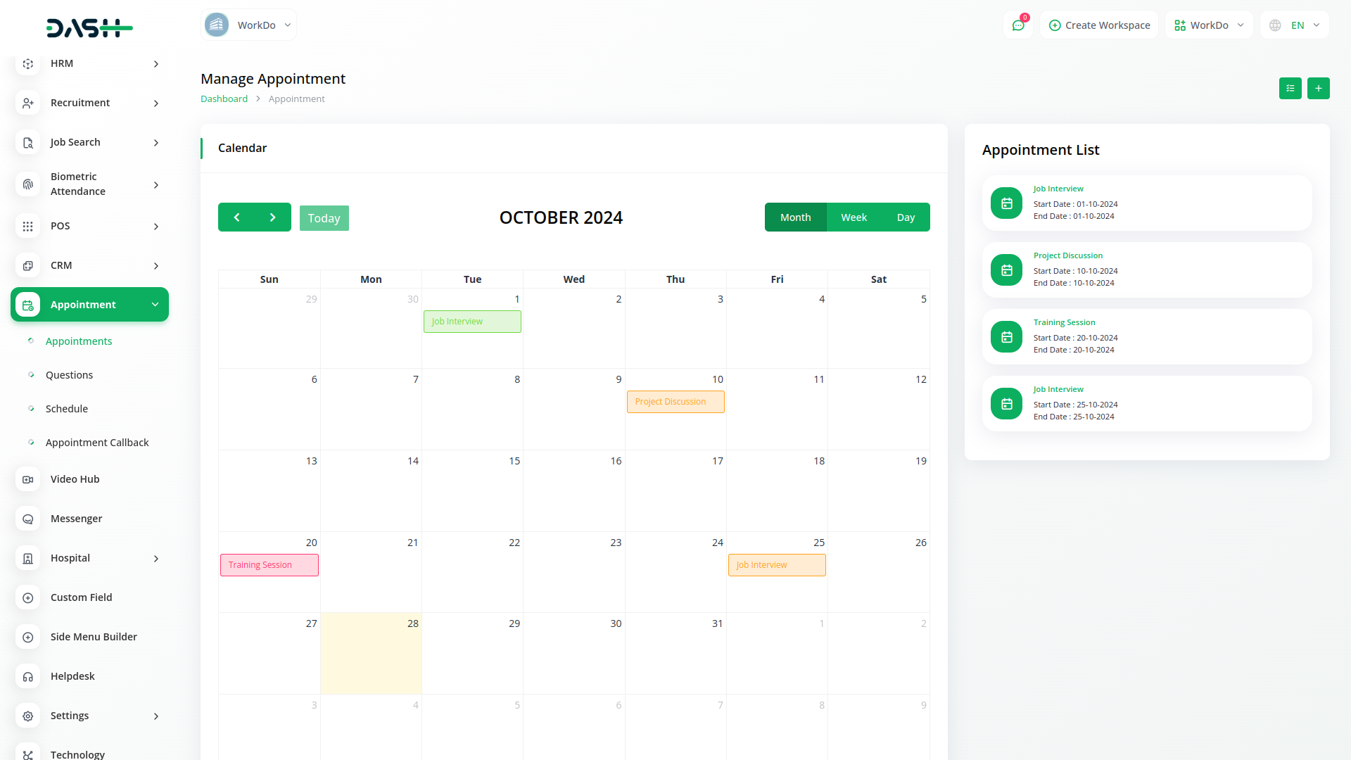 In the appointment section, you can create an appointment. It has a calendar button that displays all appointments and changes color according to the appointment status. It has a copy link button, in which any user can fill out the appointment form.